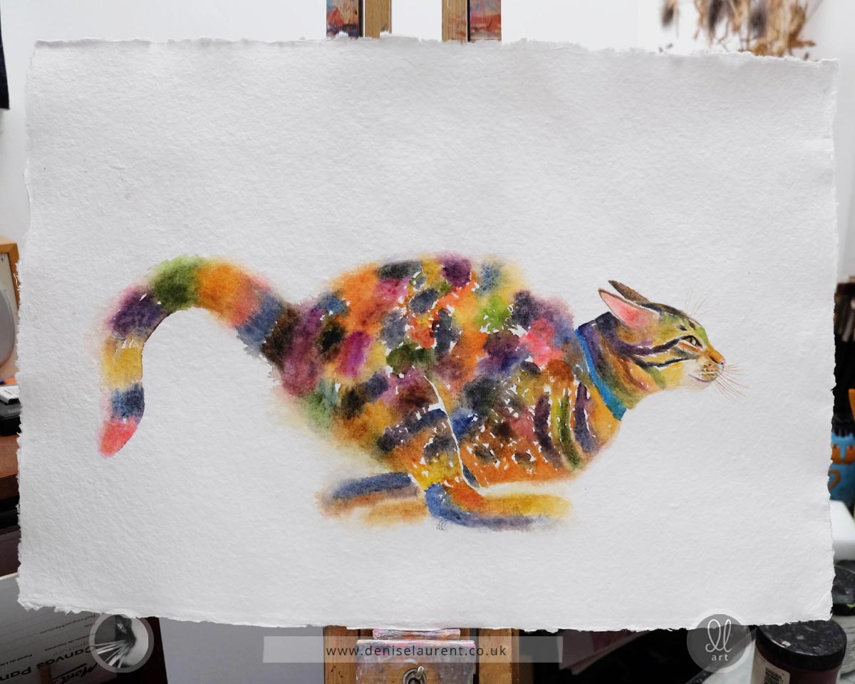 She’s painted in watercolour on beautiful handmade paper with natural deckle edges. Soft washes of green, pink, blue, purple and warm orange flow through her stripes and spots, giving the piece a wonderful sense of movement and life.