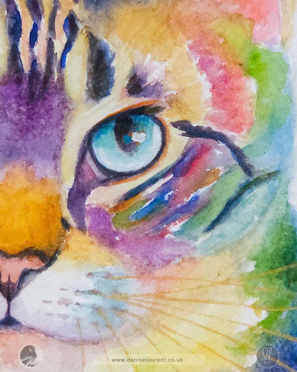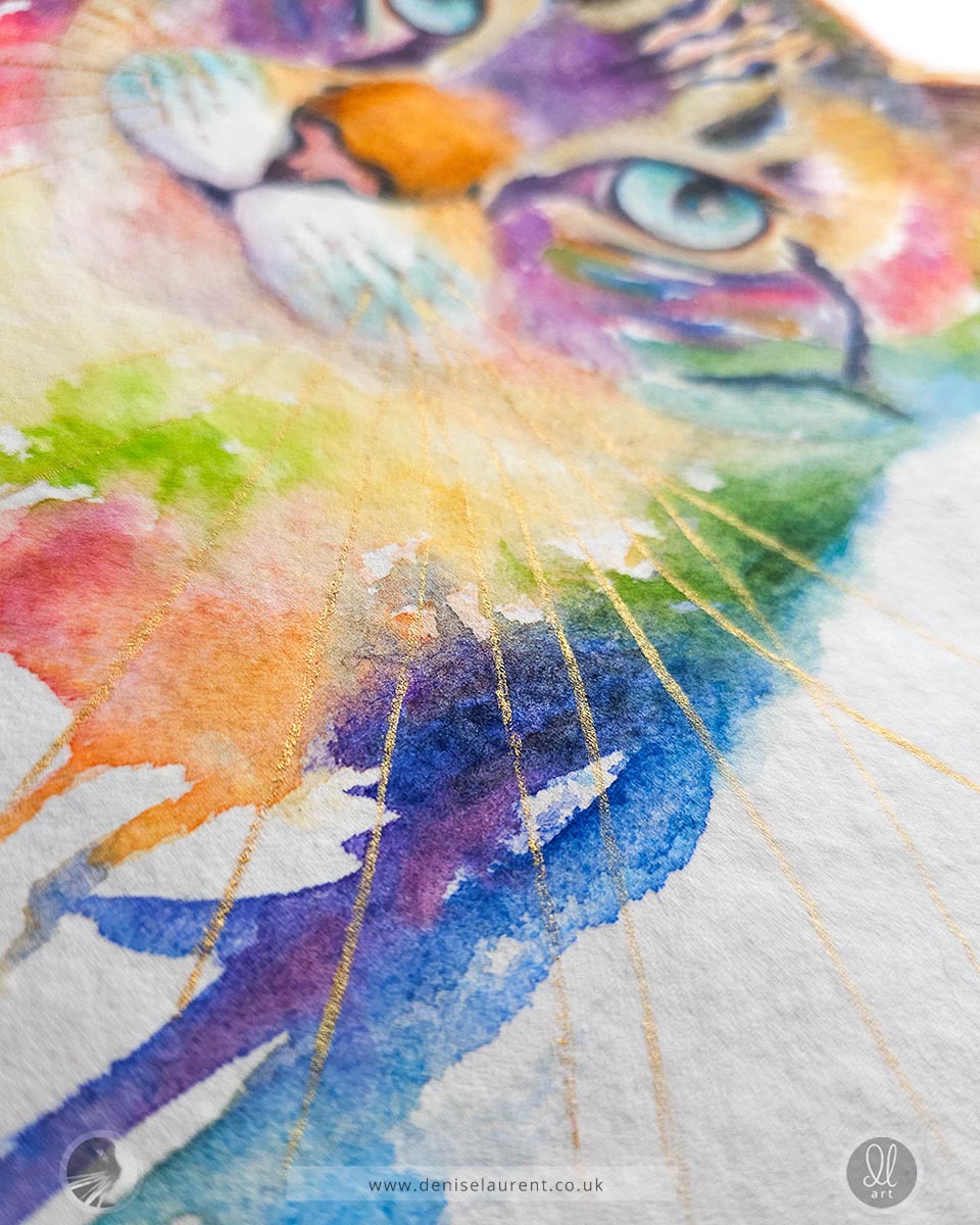 Sneakers, calm, curious, and showing off those gorgeous aqua blue eyes. I painted him on handmade paper with flowing watercolours in purples, pinks and soft greens, and added shimmering gold whiskers to finish his look.