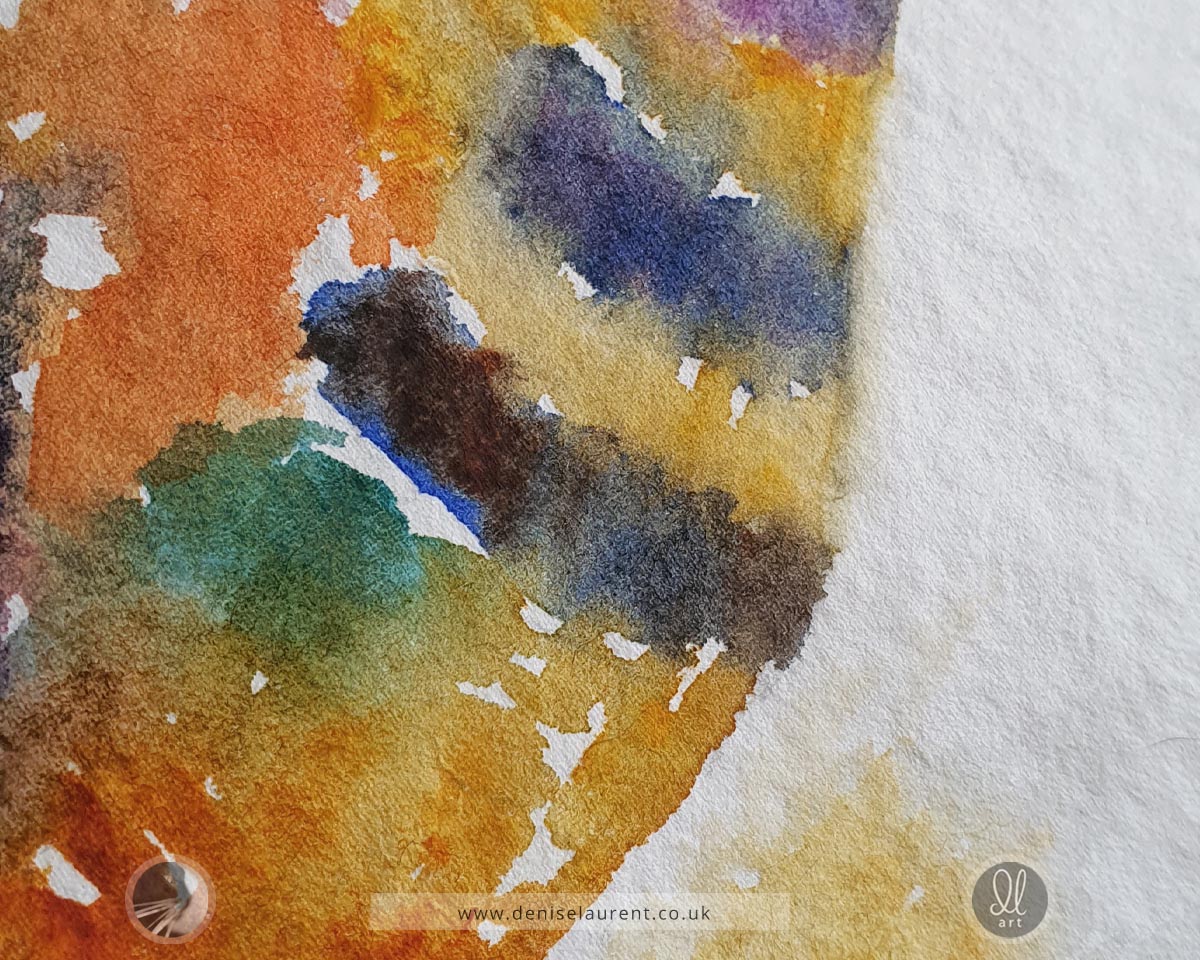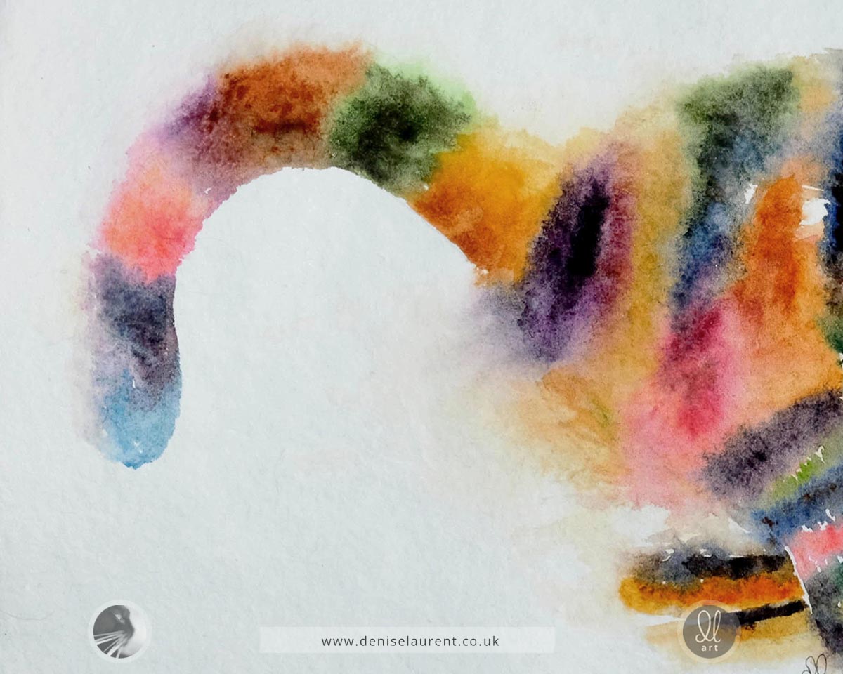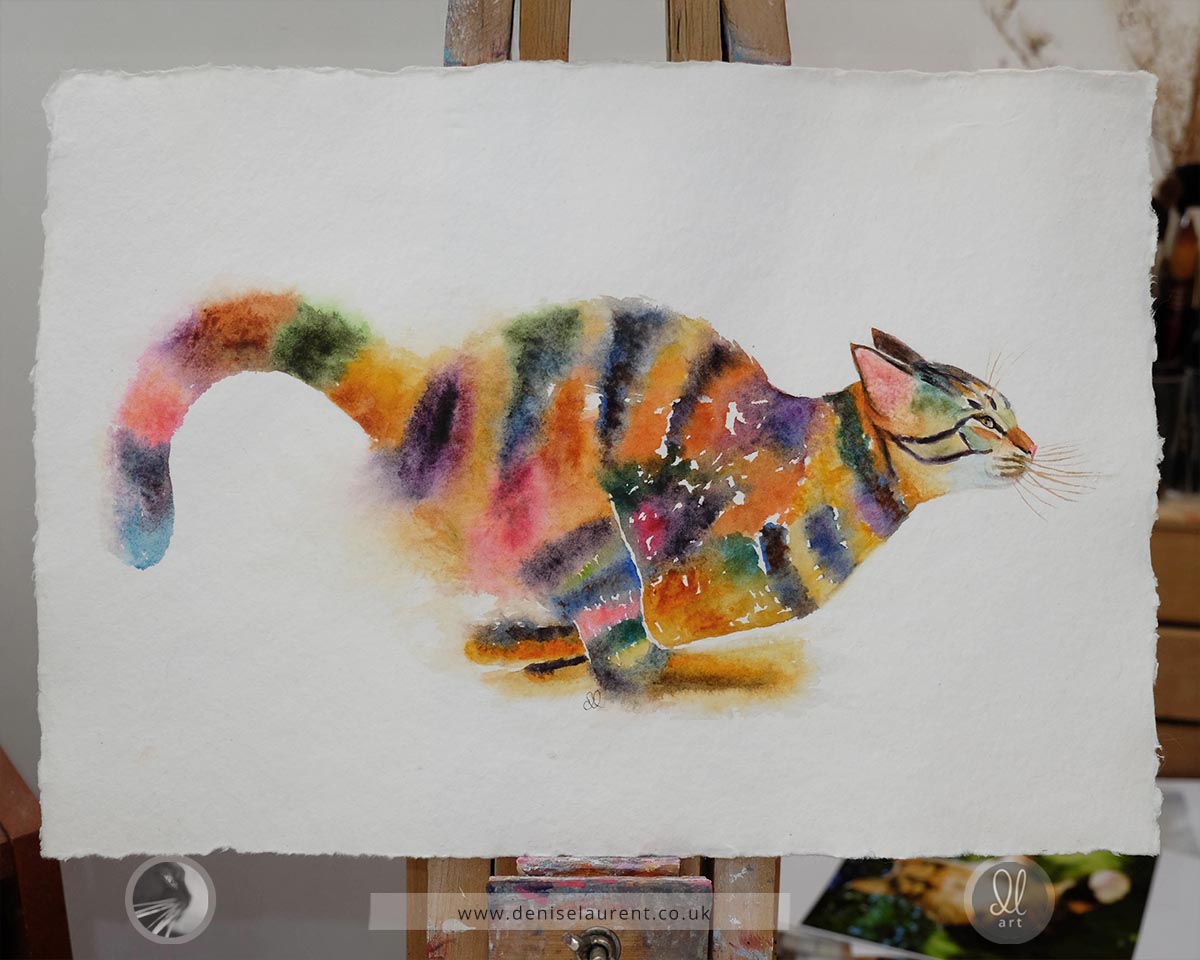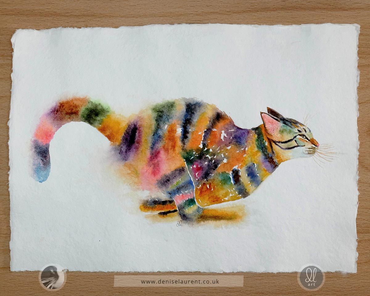 Painted in watercolour on beautiful handmade paper with natural deckle edges, soft washes of green, pink, blue, purple and warm orange ripple through her stripes and spots. The colours give her a real sense of movement and life, finished with delicate gold whiskers that catch the light.