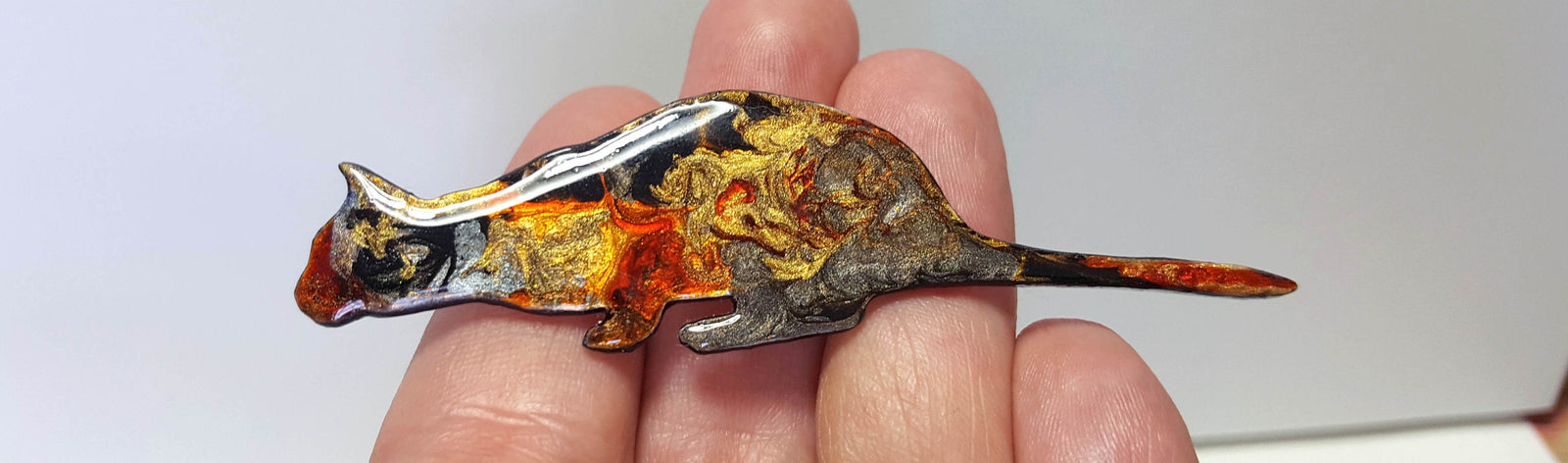 I make handcrafted animal brooches and leaf pins, using resins, colours and gold leaf. Each piece is a unique work of art. Brooches add sparkle pinned to a dress, jacket, or sweater. Or a touch of style to a hat.