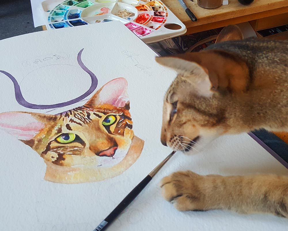 I'm a cat fanatic and an artist. I currently owned by three cats. Slinky is the studio manager and keeps an eye on everything I do. He's also adorable.