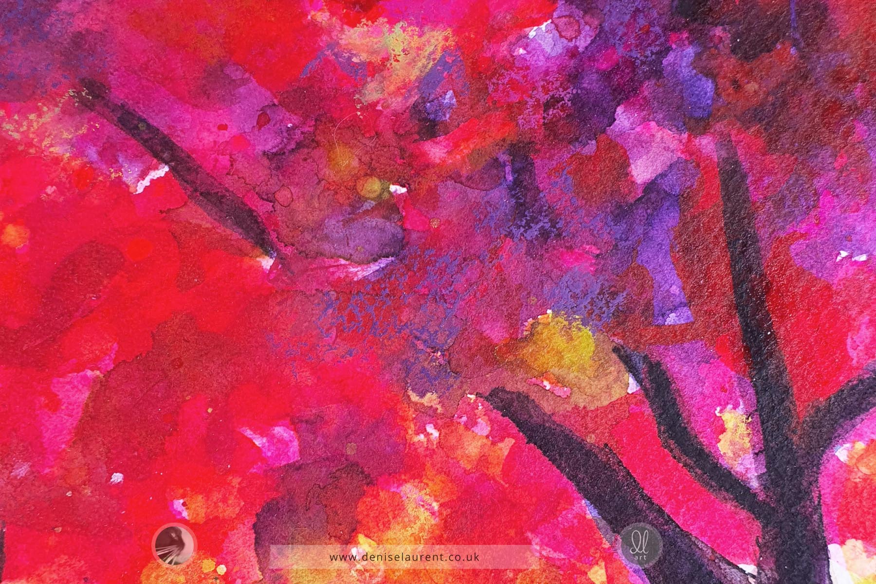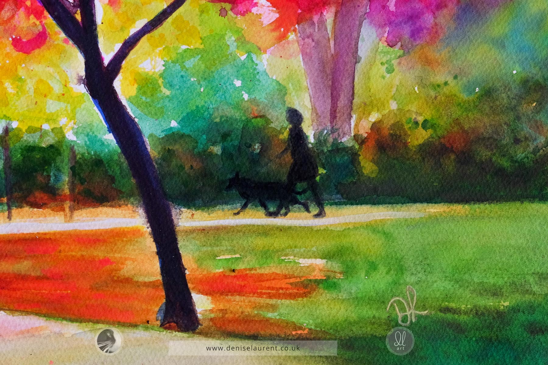 Painted in watercolour in a loose, expressive style, a figure walks a dog through the park, surrounded by colourful trees glowing with autumnal colour. The foreground trees are ablaze with red and purple leaves, while the background trees shift into golden greens. Paths weave through the landscape, adding depth and movement to this vibrant urban scene. There are touches of pastel in the painting.
