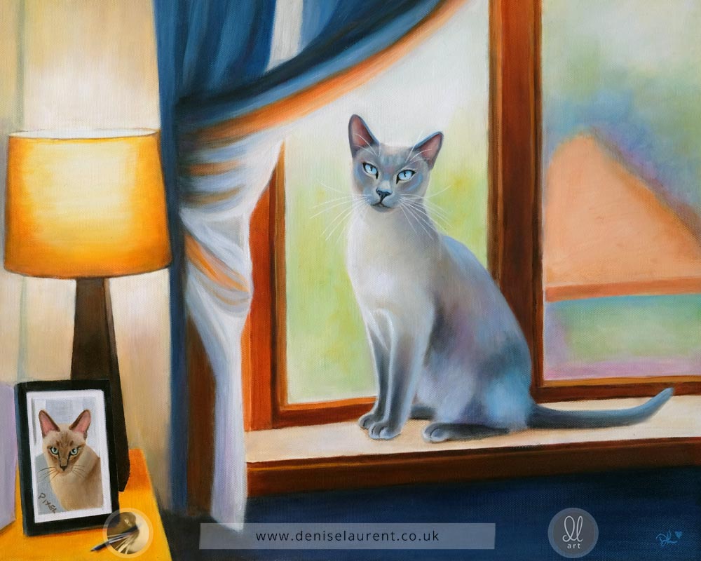 A portrait of Pixel sitting in the window. On the table is a portrait of him as a kitten. Pixel is a blue tonkinese and his colours changed quite a bit as he grew up. His favourite thing to play with is a pen so a pen appears on the table by his kitten picture, ready for him to swipe off with a paw.